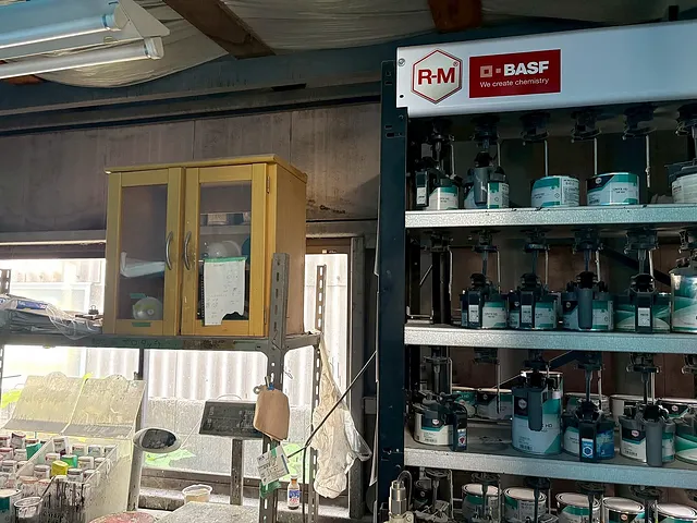 工場内には100色以上の塗料を常備した調色設備を設置しております。熟練の職人がお車に最も近い色を調色し、ムラなくきれいに仕上げます。