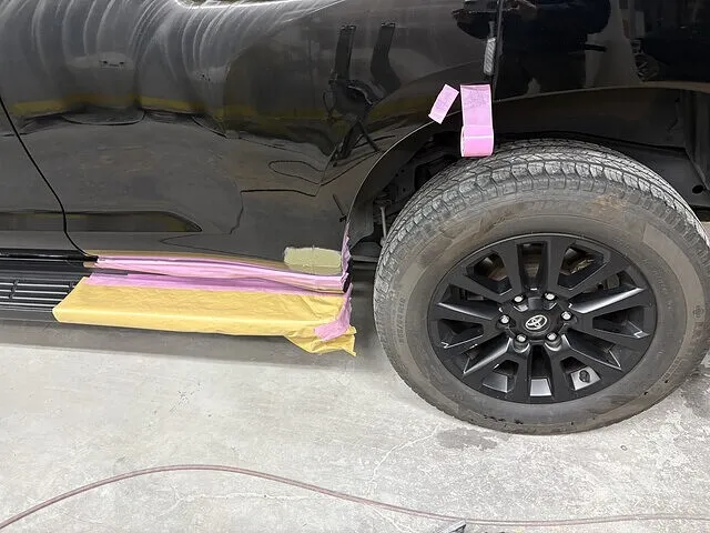 タイヤのすぐそばで、丁寧にマスキングされた車体が目を引きます。